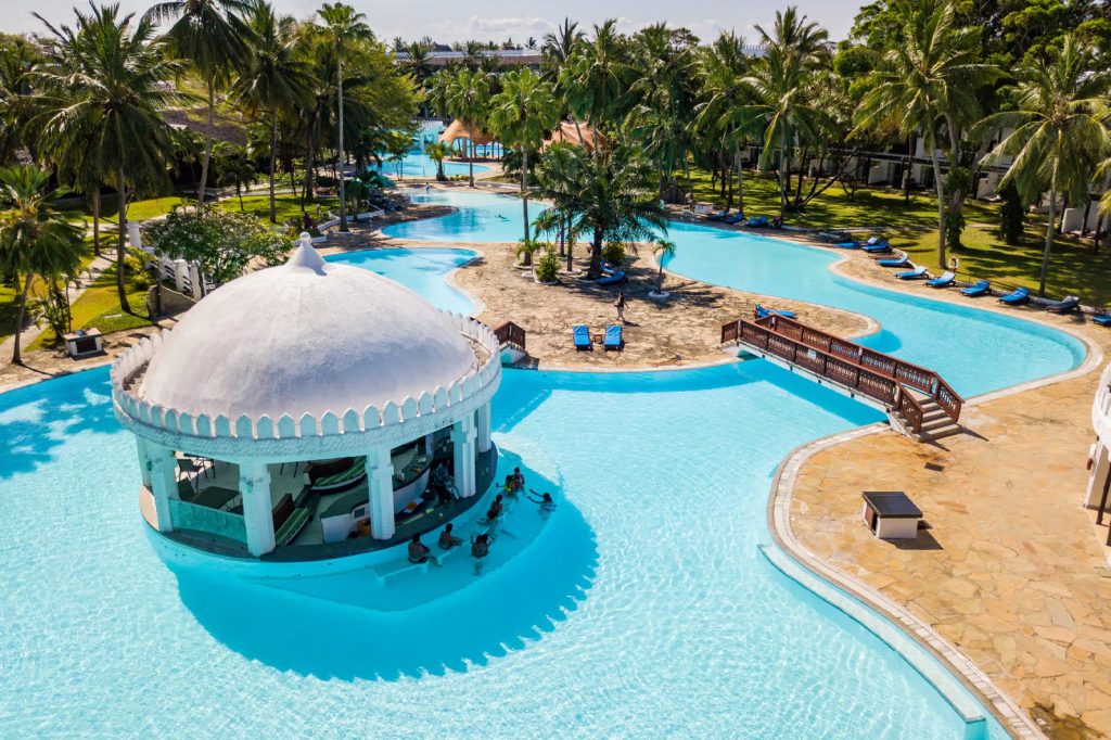 After breakfast at the resort, you’ll head out on a half-day excursion to Wasini Island and Kisite Mpunguti Marine Park. You’ll snorkel in coral-rich waters, spot dolphins, and enjoy a seafood lunch on the island — this trip is a must for nature and ocean lovers. Return to the resort in the afternoon and enjoy a cocktail from the beach bar or take a relaxing dip in the pool. In the evening, you can choose to dine at the resort again or book a table at Ali Barbour’s Cave Restaurant, a romantic coral cave dining experience located just a few minutes away. After dinner, enjoy the cool coastal breeze and maybe catch a beachside performance back at the resort.